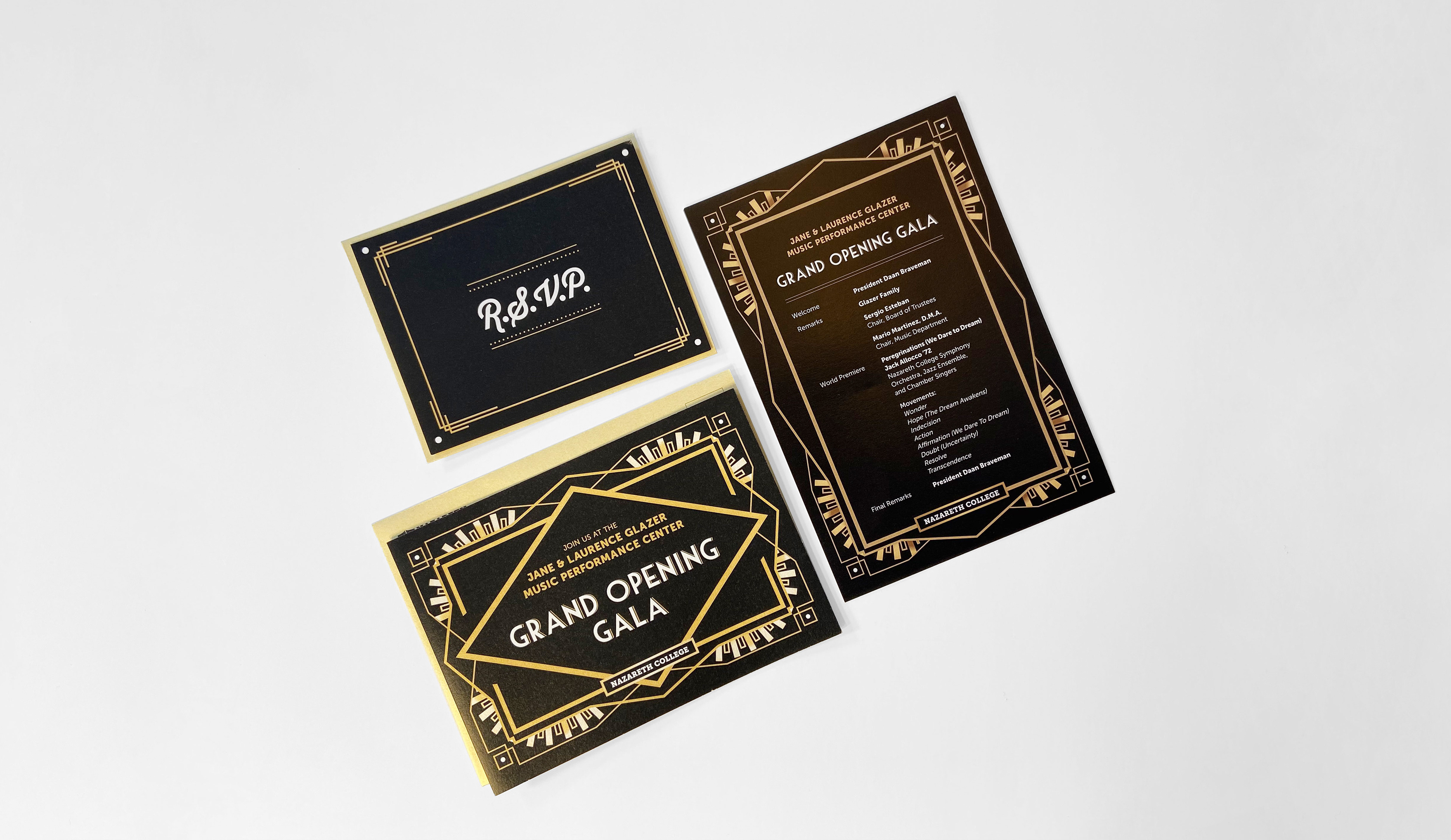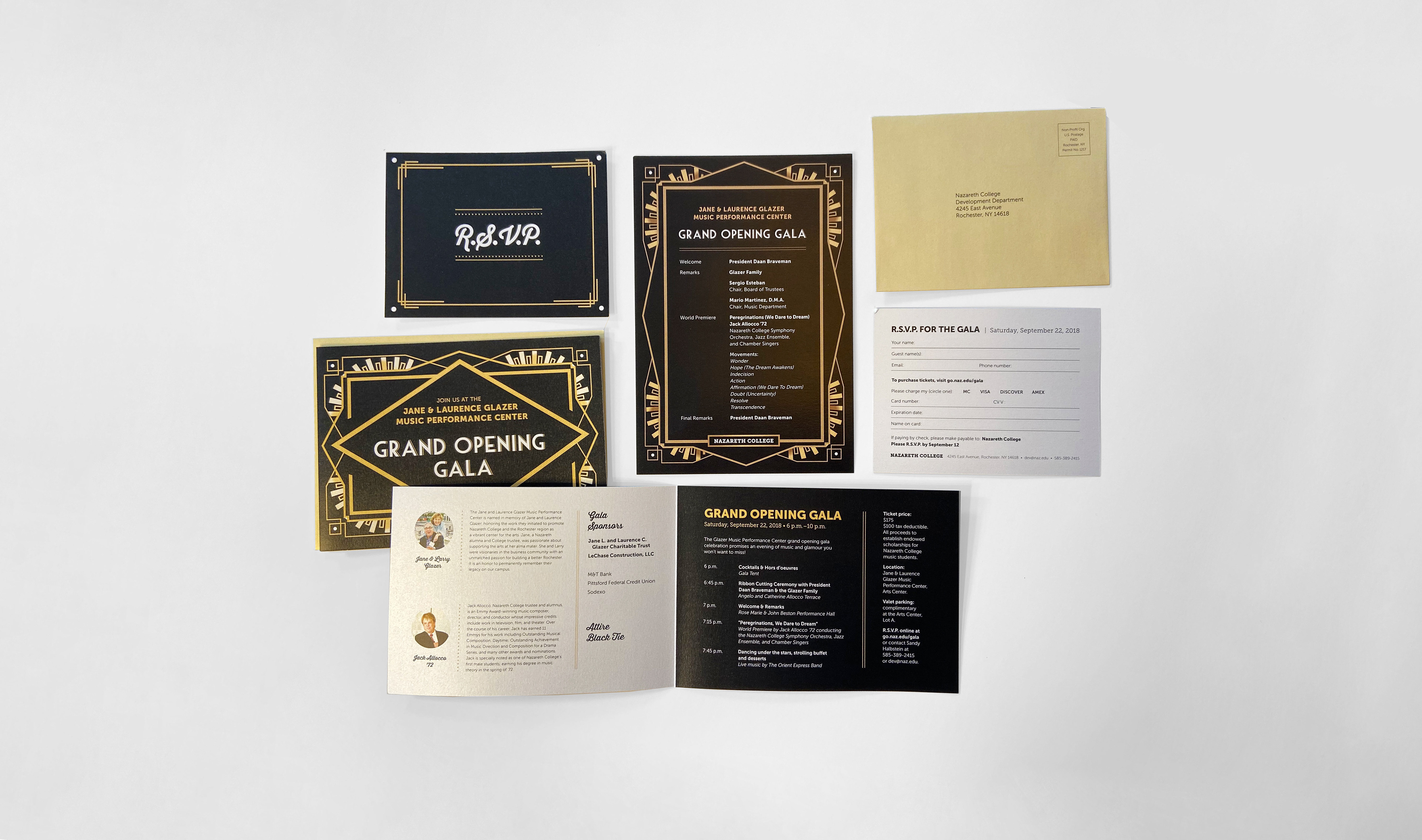 In 2018 the Glazer Music Performance Center had its speakeasy-themed grand opening as the premier music performance hall in Rochester. I was tasked with designing the print collateral for the event as well as an animated video about the acoustics in the space. Following the speakeasy theme I worked with our vendors to produce save the dates, invitations, event programs, walk of fame stars, and an assortment of smaller print details for the event.