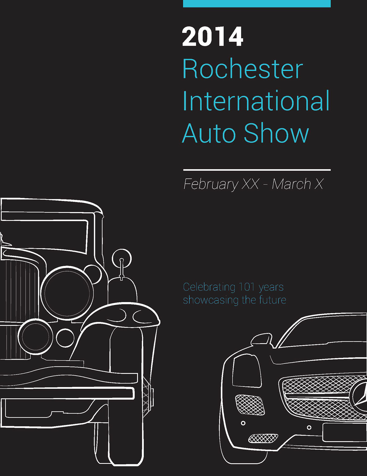 Cover design for the 2015 Rochester Auto Show. Past booklets were graphically overloaded, so the design was intended to be clean and simple. The theme was the development and history of the automobile; past and present. I chose two very different decades of cars and drew them simply. This emphasized the design of the cars and their change over time in design, size, and character.